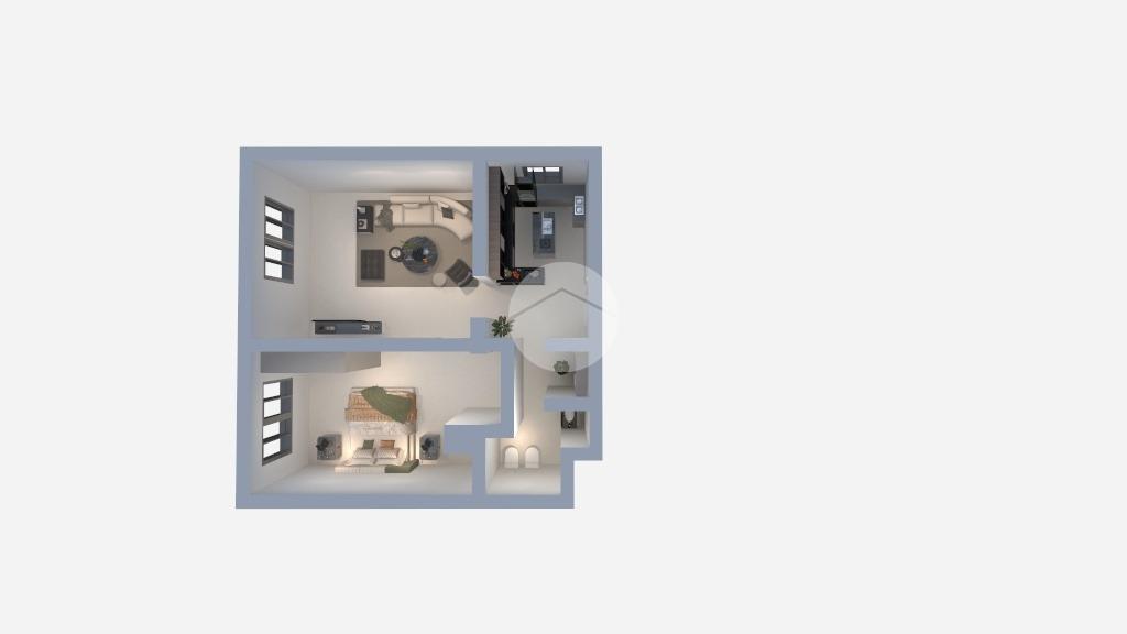 Il portone d'ingresso volge sulla zona giorno che è caratterizzata da un soggiorno con angolo cottura.