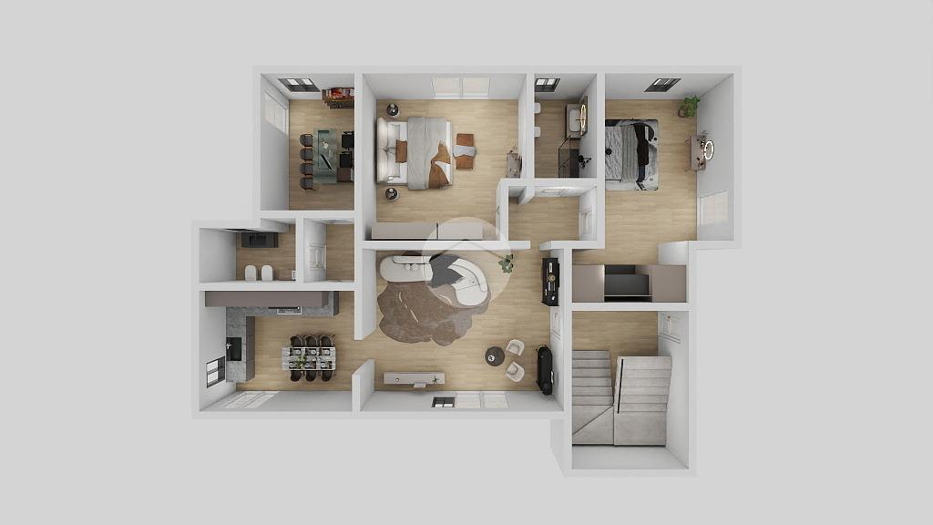 Dalla scala interna in legno, si accede al piano mansardato, composto da un mini alloggio di soggiorno con angolo cottura, due camere luminose ed un bagno.